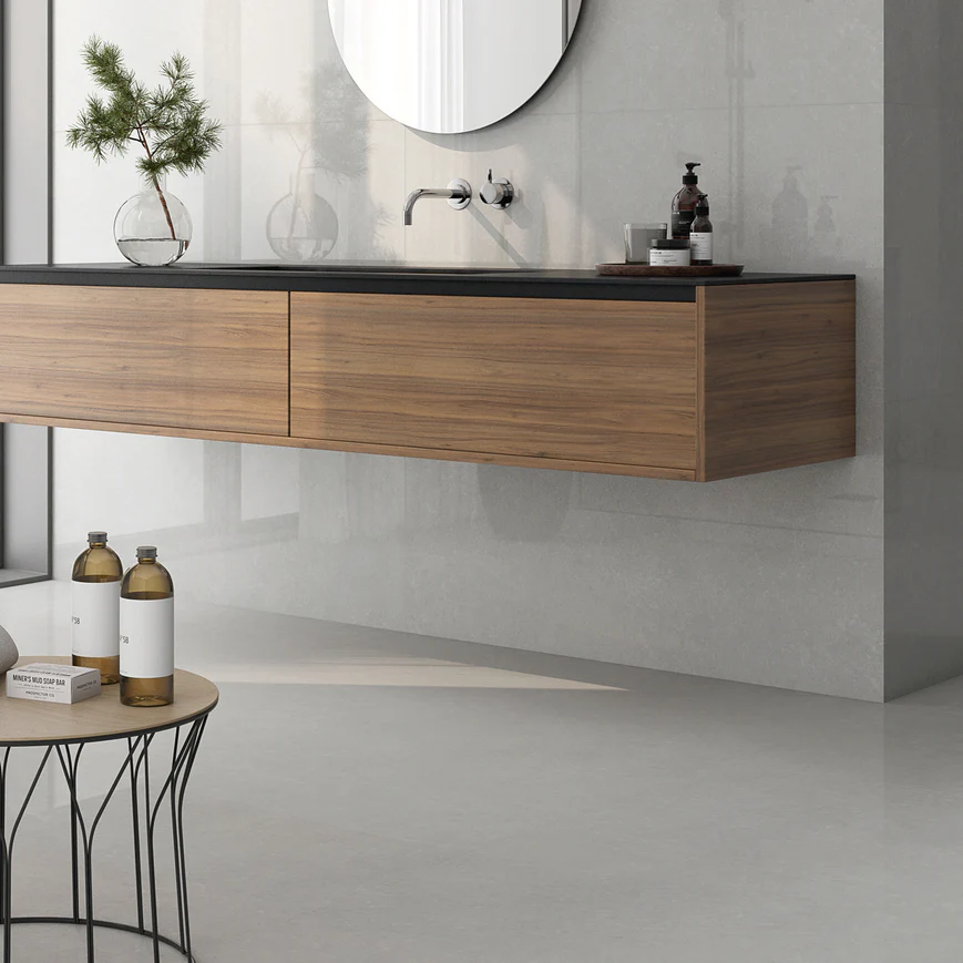 Dose White porcelain tile delivers a clean and luxurious aesthetic with the brilliance of a polished finish. Designed in a 24” x 48” format, this tile creates a sleek and seamless appearance that enhances light and openness within interior spaces.